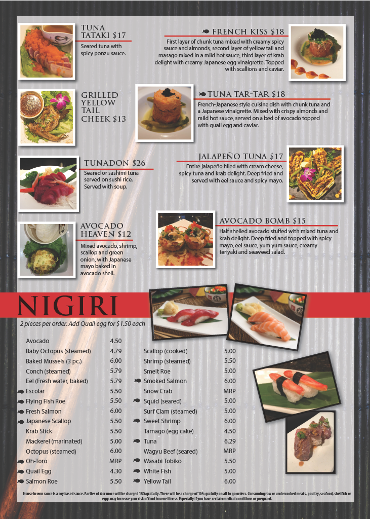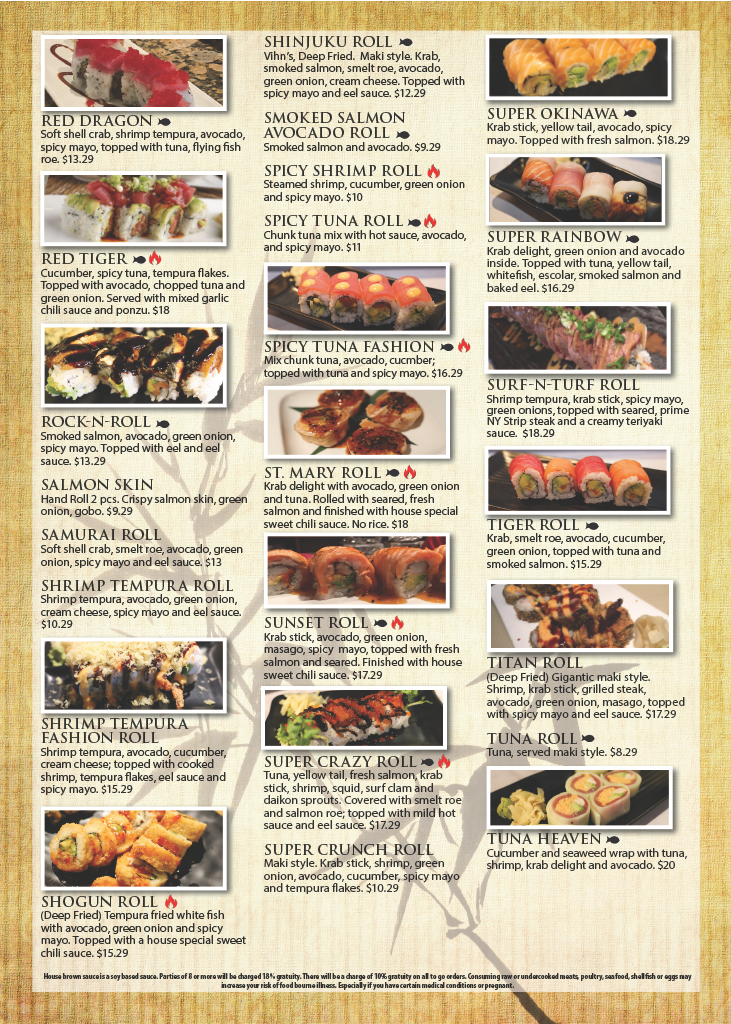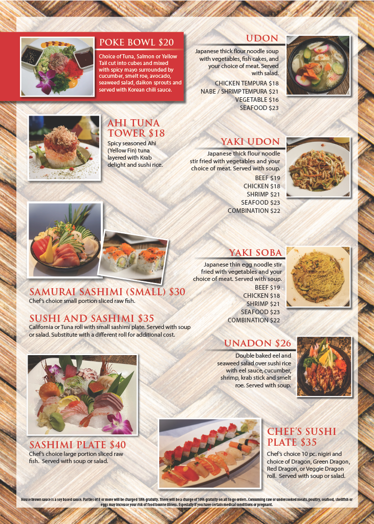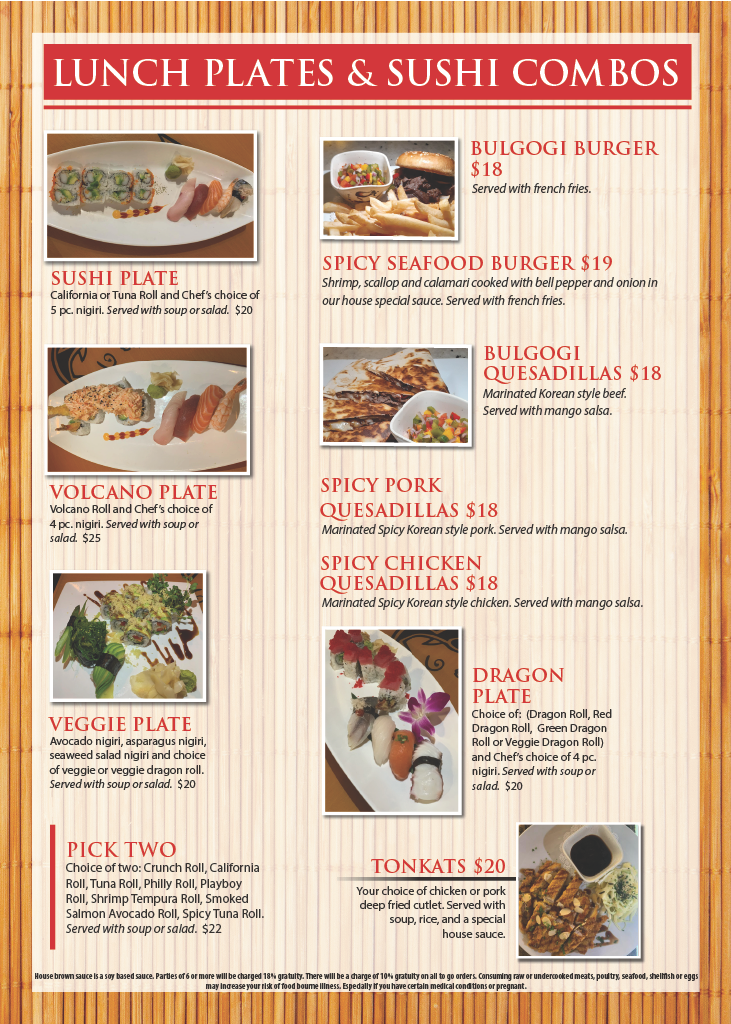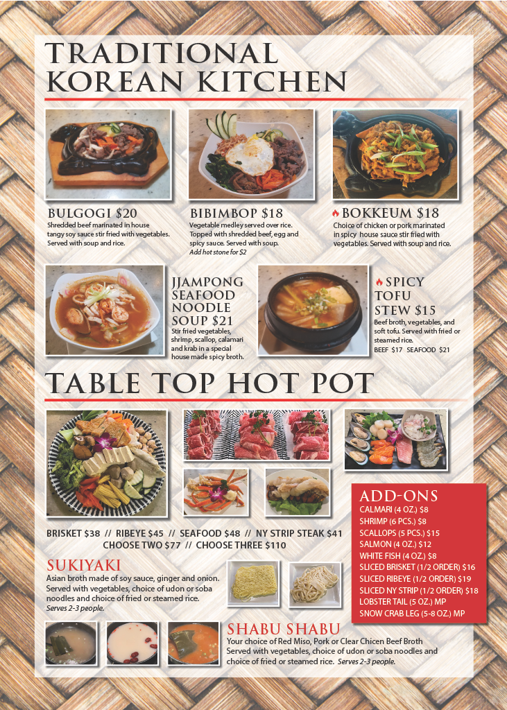 Our extensive menu includes Korean Barbecue as well as over 100 sushi rolls, Japanese ramen, noodle dishes, teriyaki, sashimi, poke bowls, and chef created specials. To compliment your lunch or dinner, we offer a full bar that includes a wide variety of sake and hand-crafted specialty cocktails. Reservations are available.